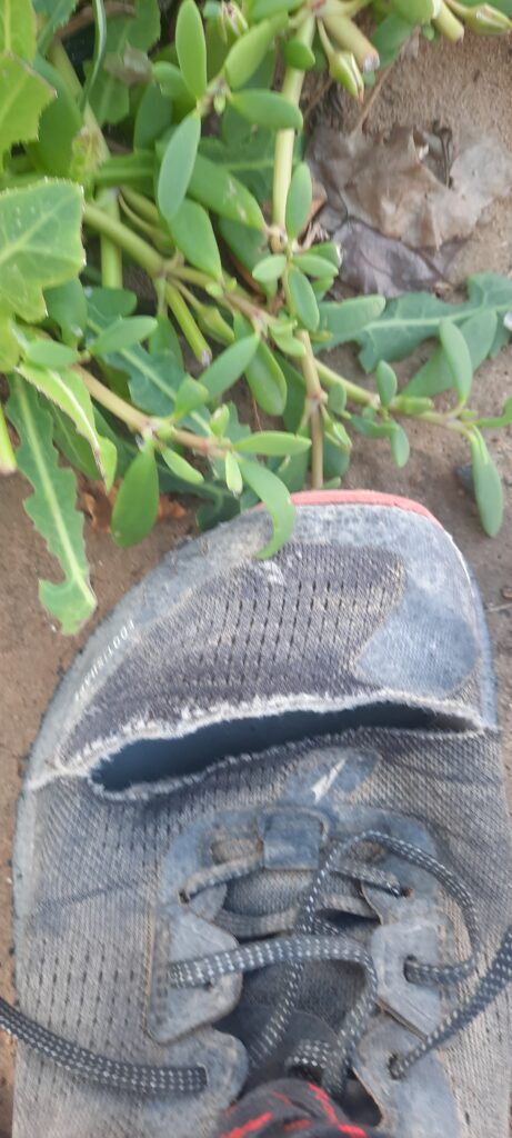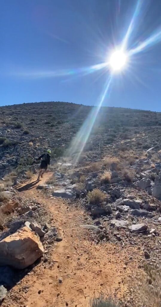 Towards the last bit of the steep descent, almost all the way down in the dried up wadi where the boulders are, I fell, diving forward onto my hands and torso. Trail body surfing! Haha. Luckily, I managed to catch myself before rolling down the side of the hill. Not too bad, just a bit of scrapes on my hands and knees. The shoe had gotten hooked again. A runner I had passed, caught up with me as I sat and re-tied my laces to see if I can get the shoe to fit better. I ensure him I was ok. Unfortunately, I did not have the black electrical tape with me, which I normally would have. It would have been a life saver. Or shoe saver. Anyways. While you can’t prepare for everything, you can adapt a mindset to be ready for anything.Grititude!