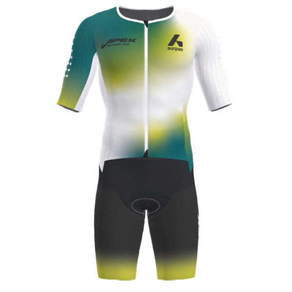 The suit has a concaved arm sleeve design with laser cut sleeves that sit close to the skin. Both the arm sleeve and leg sleeve lengths are optimised to truly maximise the aerodynamic effect of the material. Strategically placed turbulators and an aerodynamic striped material on the side panels add to the suits aerodynamic profile. A slightly deeper set neck opening and panels on the chest and upper-arm ensure optimal comfort in the upper-torso yet remain unrestrictive.